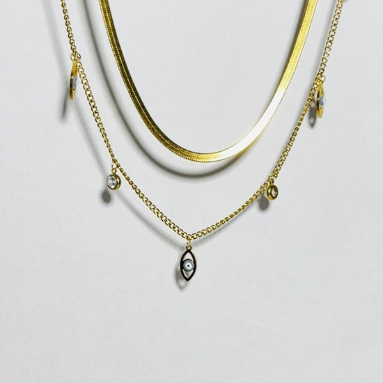 This Evil-Eye Charm Necklace is both stylish and sophisticated with its double layered design. Crafted with a modern touch, this necklace adds a touch of class to any outfit. A must-have piece of jewellery for those looking to make a statement.